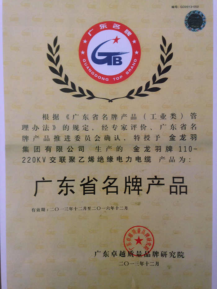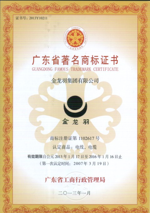 多年来,金龙羽集团股份有限公司 通过IS9001质量管理体系认证,以科学的管理和完善的检测手段,确保了向客户提供的产品合格率为100%, 在历年来国家、省、市等各级质量认证中心和广东省公安厅消防局等相关权威部门的认证,在市场上的占有率逐年稳步提高, 许多重大工程项目指定使用“金龙羽”牌产品,产品得到了中国人民保险公司深圳市布吉分公司的质量承保。 2002年和2003年被权威评审机构——广东省名牌战略推委员会评为“广东省名牌产品称号”,是深圳市电缆电缆行业中唯一获得此殊荣的企业; 成为1999年至2003年深圳产品质量监督所授权深圳市电缆电线行业中唯一可使用“质量跟踪产品”标志的企业; 1996年至2003年连续八年被深圳市质量技术监督授予“产品监检质量好企业”等荣誉称号,并被国家经济贸易委员会列入 《全国城乡电网建设与改造所需要设备产品及生产企业推荐目录》;2005年通过了二级计量保证同年被国家质量监督检验检疫评为“国家免检”产品。