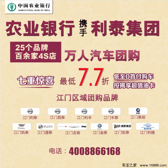 七重惊喜“价”给你 一重礼: 【提前报名并预交500元报名费,享受2000元售后养护套餐】 二重礼: 【7分钟总裁权限折扣时段,最低7.7折,价格买贵,3天包退】 三重礼: 【计时万元精品大礼包,早订早抢】 四重礼: 【七夕情侣大考验,赢取七夕浪漫大奖】 五重礼: 【尊享低至0首付购车】 六重礼: 【订车砸金蛋赢现金,100%中奖,万元外币现金大奖七夕专享】 七重礼: 【订车还可参与订车抽奖活动,100%中奖】 活动报名热线:0750-3285088 利泰集团有限公司总部位于广东省佛山市,成立于1998年,是一家涵盖汽车业务和金融业务两大板块、拥有进出口经营权的综合性企业集团。 截止2014年底,集团旗下子公司、控股公司100余家,员工5000余人。经营范围涵盖广东、湖北、四川、江西、黑龙江、安徽、云南等7省29地区。利泰集团,您的汽车专家! |