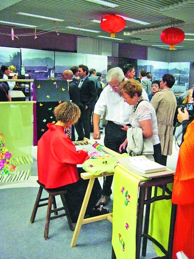“美丽浙江非物质文化遗产展”日前在瑞士汝拉州德莱蒙小城开幕。展出的温州米塑、湖州毛笔、木偶、漆泥、杭州刺绣等工艺美术作品,受到了瑞士观众的热烈欢迎。浙江省与汝拉州是友好省市。图为两名瑞士老人正在···