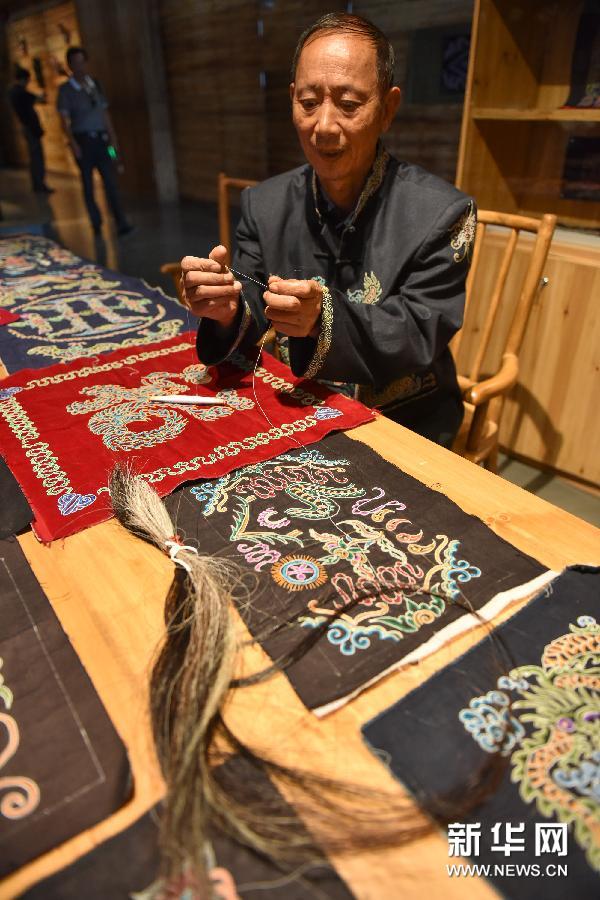 7月24日,一名匠人在展示国家级非物质文化遗产“水族马尾绣”的制作过程。