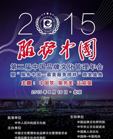 2015年8月16日,以“诚信创新服务中国”为主题的第二届中国品牌文化管理年会暨“服务中国”成果发布会在北京天伦王朝酒店举行。据悉,年会由中国文化管理协会品牌文化管理委员会主办,并获得了···