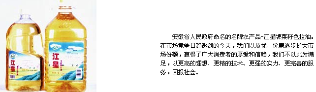 我厂是省级农业产业化50强龙头企业之一,座落在长江中下游鱼米之乡-巢湖市无为县,通过10余年的努力拼搏,现已发展成为拥有两条自动化流水作业"浸出"生产线和一个日产50吨的色拉油生产线、年销售收入超亿元的安徽省明星企业、省农业产业化龙头企业,中国油脂学会会员单位,跻身全省50强企业行列。全厂占地12余万平方米,固定资产近亿元,98年国家外贸部赋予自营进出口权。主产品江星牌菜籽色拉油2000年9月被安徽省人民政府命名为"安徽名牌农产品",并荣获99北京国际农博会金奖;产品畅销江西、四川、湖北、上海、辽宁等20多个省市,副产品饼粕出口到欧盟,年创汇400余万美元。董事长汪开发同志95年4月被国务院授予:全国劳动模范。