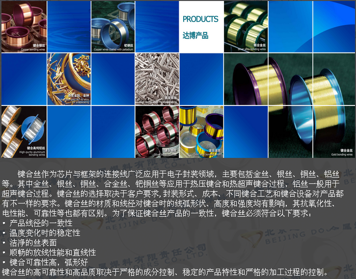公司的主要产品为集成电路(IC、LSI、ULSI)、半导体分立器件(TR)和半导体照明用发光二极光(LED)封装用键合金丝、键合铜丝、键合银丝、键合铝丝及各种合金键合丝系列产品,包括高性价比的超软铜丝、钯铜丝、金银丝等;同时还生产芯片背金用蒸发金、蒸发金砷、蒸发银的丝材和段材。