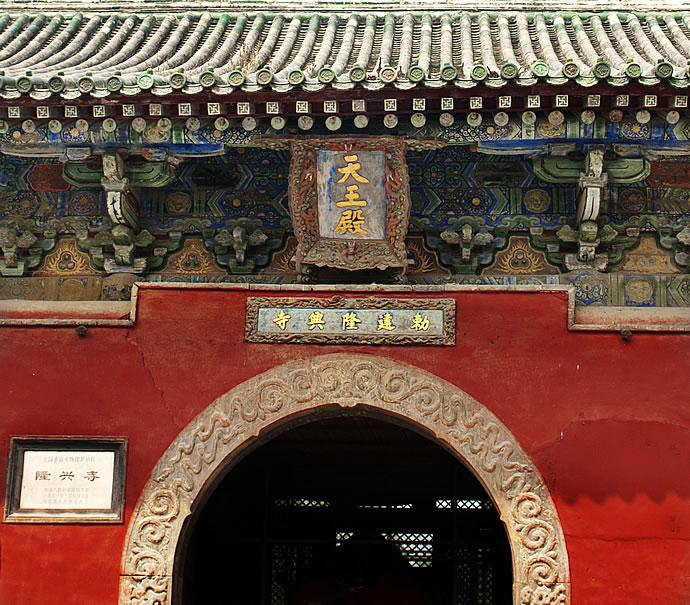 隆兴寺没有山门,前面仅有一座高大的琉璃照壁。绕过照壁,自三路单孔石桥向北,迎面是寺院的第一座建筑天王殿,单檐歇山式,七檀中柱式建筑,中有圆拱形大门,门上部横嵌着康熙皇帝亲书的“敕建隆兴寺”金字匾额,兼有山门作用。