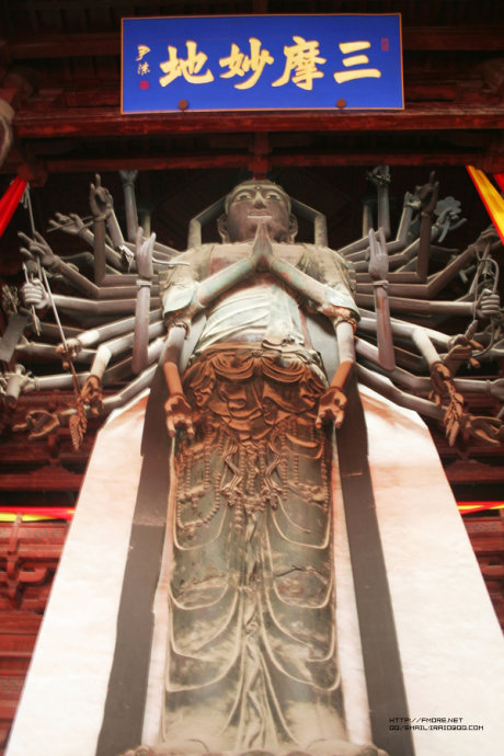 穿过大觉六师殿遗址北行就是摩尼殿,摩尼殿是该寺主要建筑之一,坐落在中轴线前部,始建于公元1052年(宋仁宗皇祐四年),总面积为1400平方米。大殿结构属抬梁式木结构,平面呈十字形。殿内的粱架结构均与宋《营造法式》相符,大木八架椽屋,前後乳栿四柱结构形式。摩尼是梵语,意为珠、宝。佛经上说:“摩尼珠,投入浊水,水即清。”摩尼殿取此名,取其去浊取清、脱离尘垢、证得清静之意。摩尼殿内供释迦牟尼,平面布局为十字形,面阔七间、近深六间。长33.32米,宽27.08米,重檐歇山屋顶,绿琉璃瓦覆顶。与一般重檐建筑不同处是把外墙砌到副阶檐下,另在副阶四面正中各加一座山面向外的歇山顶抱厦,宋代称“龟头屋”。