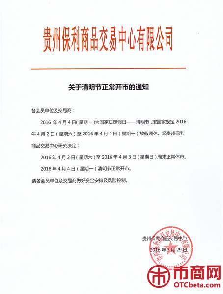 中国品牌网:2016年3月30日贵州保利商品交易中心官网发布了关于清明节放假的通知。 原文如下: